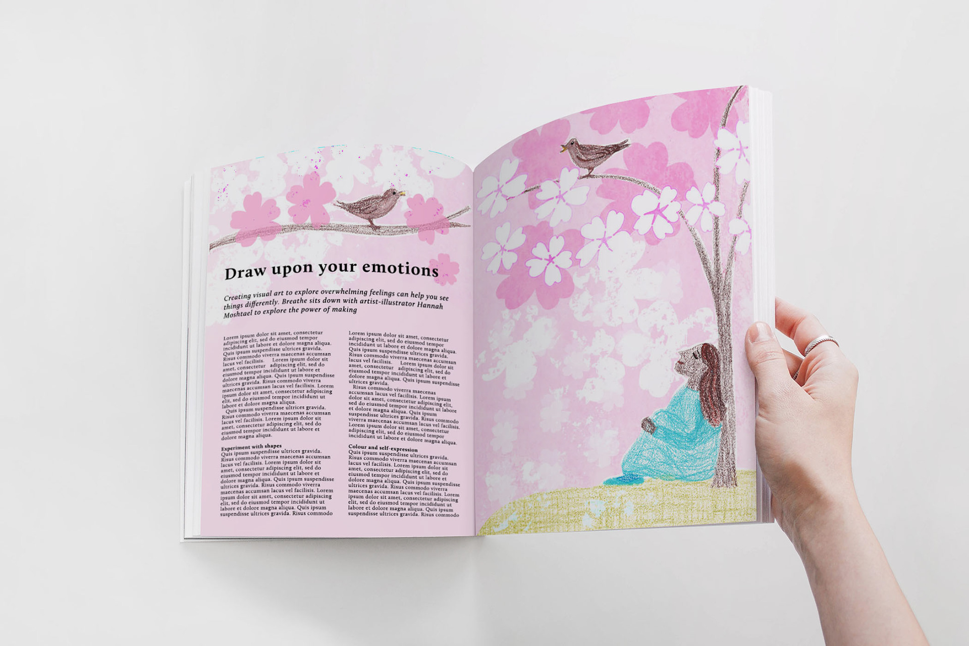Pastel and collage illustration of a woman and a nightingale by a cherry blossom tree for a personal project by Hannah Moshtael, editorial illustrator available for magazine commissions.